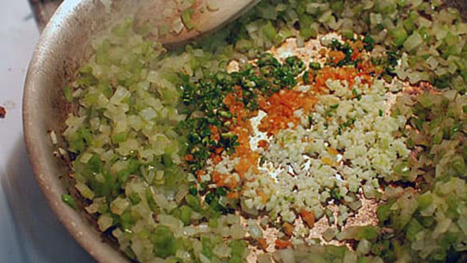 Step4Brown the ground beef and drain most of the oil. Remove from the pan and set aside. Cook the onions and peppers in some oil. Salt. When they start to brown, add the garlic and chiles. Add in the cooked beef and stir to coat everything. Next add the spices followed by the tomatoes and hot sauce. Rinse the beans and add. Simmer for 15 minutes to get the flavors all blended.