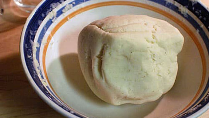Step2Make thin rounds out of the dough, about 1/3 inch thick. Cook in a dry cast iron skillet on medium/high until it is browned on both sides. Split with a fork, keeping half of the edge intact, making a pocket.