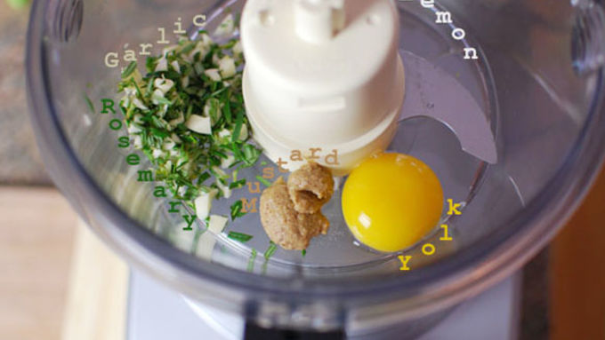 Step1Make the aioli - In a blender or food processor, add all the ingredients except for the oils. Turn on and process for about 30 seconds. With the machIne still running, very slowly drizzle in about 1/4 of the oil and stop. Watch mixture and as you see it thicken slightly, very slowly add more of the oil until it is all added.