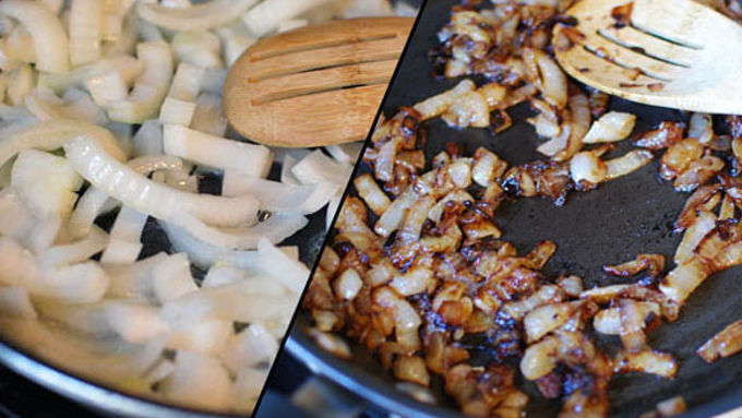 Step2Caramelize the onions - Slice the onions into 1/4 circle slices. Saute in butter on medium for about 45 minutes, stirring often until they become very brown.