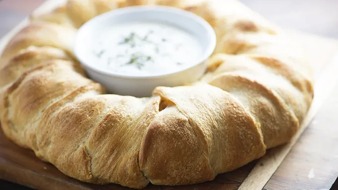 - Creamy, cheesy chicken spiked with ranch and bacon and baked up in perfectly flaky crescent dough! If there’s one thing in life that I know how to do, it’s throw a party with ridiculous food. I mean, I would absolutely love to eat party food for every meal of the day, but I feel like maybe that would be a bad choice. So I tend to go all out on the weekends and basically invite people over just so I have an excuse to eat like a drunk college student. Also, just in case you haven’t figured this out about me yet, my motto is, “Mo’ ranch, mo’ betta”. You’ll see what I mean in just a minute. First, I’m going to show you how to make some dang good party food. This crescent ring is easy to the peasy and full of a super creamy and cheesy mixture of chicken, bacon and ranch. Now, remember how I said that mo’ ranch is mo’ betta? Well, I didn’t lie. I mean, I’m from the Midwest. Ranch flows through my veins. So, I went ahead and placed a little bowl of ranch dressing right in the center of the ring and dipped to my heart’s content.