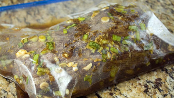 Step5Add marinade ingredients to a large plastic bag. Mix well. Once tenderloin is out of oven and cooled a bit, add to bag.![]()