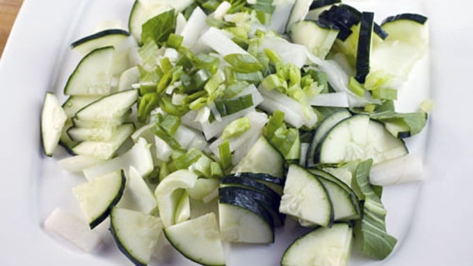 Step7When ready to make the salad, dice salad ingredients and make a bed on each plate.![]()