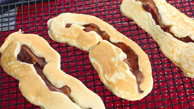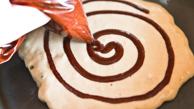 Step5Spray your hot griddle with nonstick cooking spray. Transfer 1/3 cup of batter to the griddle. Immediately pipe a swirl of cinnamon around your pancake, so it looks like a cinnamon roll.