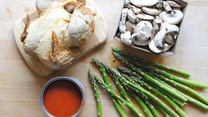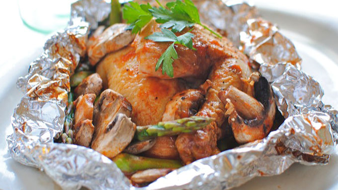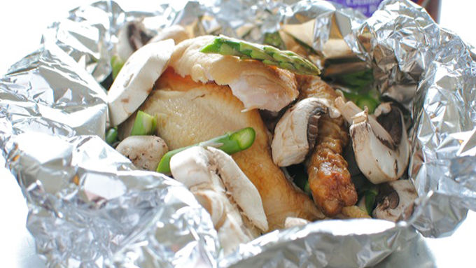 Step2Divide the chicken pieces between 4 foil packets. Evenly divide the asparagus pieces and sliced mushrooms over the packets.![]()