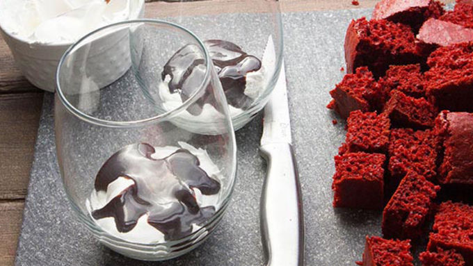 Red Velvet cake is layered with hot fudge, whipped cream, and strawberries for a dessert so pretty, it may just find you falling in love!