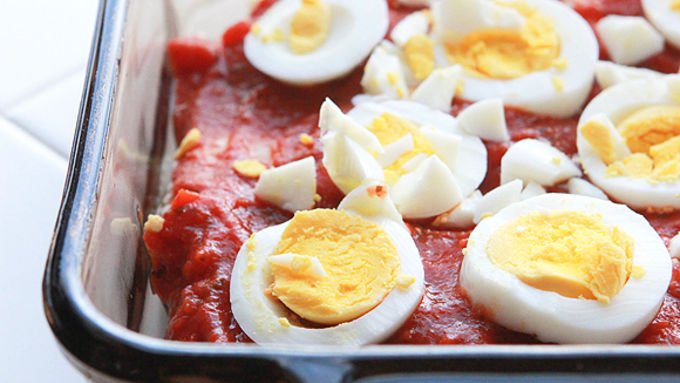 Step4Place a layer of hard-boiled egg slices on top of the spaghetti sauce.