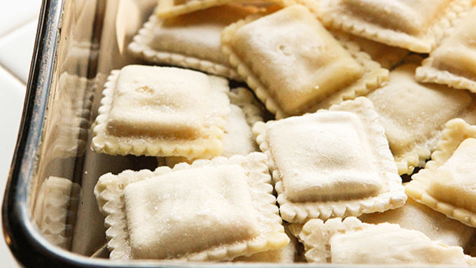 Step2In a 9x9 baking dish, layer half of the ravioli onto the bottom of the dish.