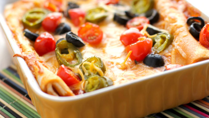 Step3Sprinkle jalapeños, tomatoes, and olives over the enchiladas. Bake in preheated oven for 12-15 minutes, or until cheese is bubbly.