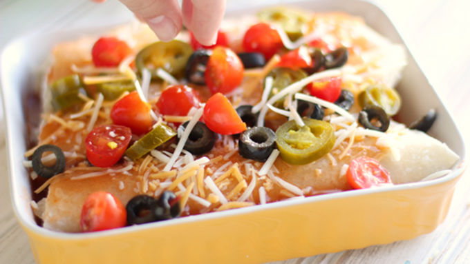 Drizzle that sauce! Slather the daylights out of your enchiladas with Old El Paso Enchilada sauce. Seriously, this recipe can’t get any easier, can it?! Give your enchiladas an extra kick of creaminess by schmearing a bit of cream cheese inside your tortillas along with your shredded cheddar.
