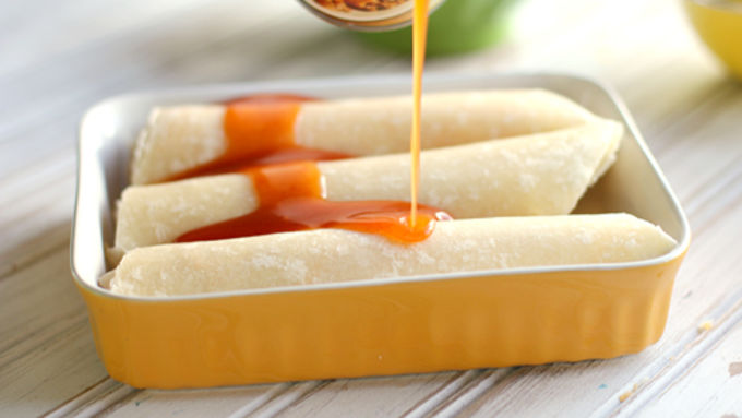 Step2Pour the Old El Paso™ enchilada sauce over the rolled tortillas. Sprinkle remaining cheese on top.