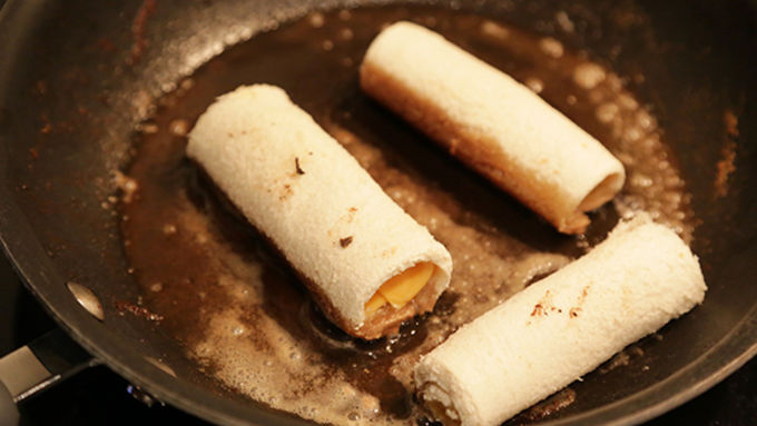 Step2Place a slice of cheese on top of each slice of bread, then roll up tightly.
