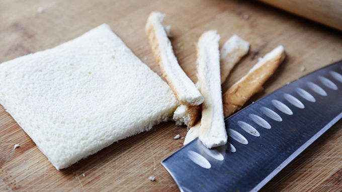 Step1Lay out pieces of sandwich bread on a flat surface. Use a rolling pin to flatten. Then, if desired, use a knife to cut the crusts off of each piece of flattened bread.