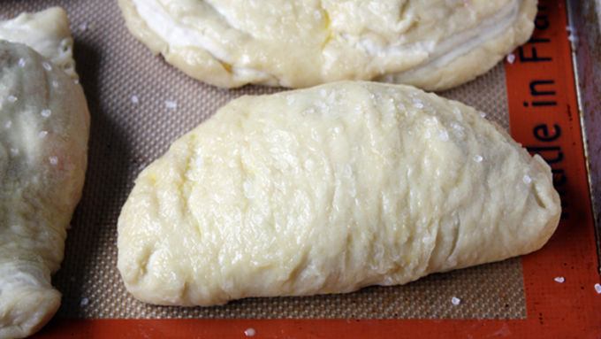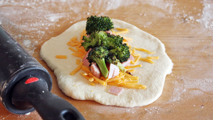Step8Place some cheddar, then some ham, then some broccoli in the center. Fold one end of the circle over to the other end to form a half moon; pinch ends tightly to seal. Repeat with each piece of dough.