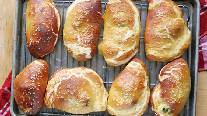 - Now I’ve really gone and done it. No, really, I have. And I’m just… so… happy. You see, for a while now – before these Ham & Cheddar Stuffed Pretzel Calzones came into my life and now it will never be the same – I’d been devising a plan to figure out how to stuff a sandwich into a pretzel, or how to make a pretzel-covered corn dog, or how to put pizza fillings inside a pretzel stick, or how to make a pizza crust that tasted like a pretzel… you get the point. But I couldn’t do it. No matter how hard my brain muscles worked and I squinted at myself in the mirror while blaring “Eye of the Tiger” on my boombox (What?...) in hopes of inspiring some sort of magical stuffed pretzel-making revelation, I only ended up with a headache and more eye wrinkles. Or crow’s feet. Whatever they call them. ANYWAY. Then it hit me. “What if I made a calzone, only I put it in a bath of boiling baking soda water (which always sounds gross) and then sprinkled it with salt and baked it and it was all stuffed with cheese and veggies and ham and gooey GOOEY GOODNESS?!” I said.