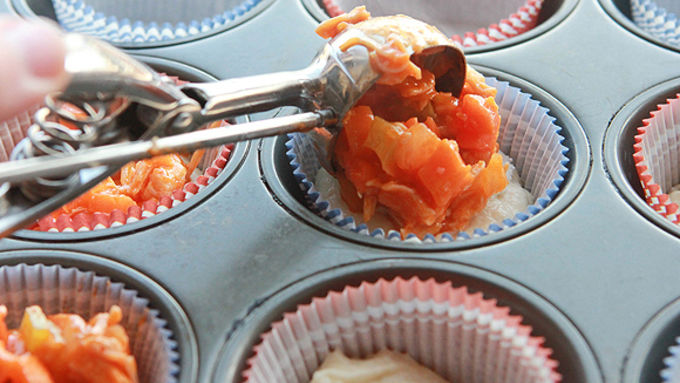Step4In medium bowl, stir together Batter ingredients with whisk or fork until blended. Spoon 1 tablespoon batter into each muffin cup. Top with about 1/4 cup chicken mixture. Spoon 1 tablespoon batter over chicken mixture in each muffin cup.