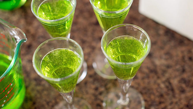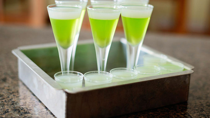 Step2Add coconut milk to a small saucepan and sprinkle gelatin over top, let sit for 2 minutes. Heat over low and add sugar. Stir until completely dissolved. Add vodka. Pour until a measuring cup and and gently pour over green layer. Chill until completely firm, about 4 hours or overnight.![]()