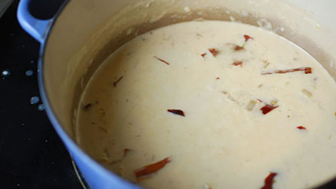 Step5Saute the onion in butter for about 5 minutes. Add the garlic and ginger and cook 1 minute. Add the chiles, then add the 3 cans of coconut milk. Simmer lightly, stirring occasionally for about 30 minutes until the chiles are tender.