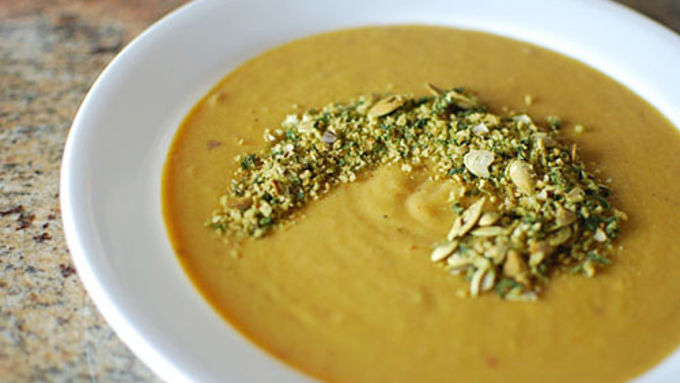 Step8Finally, make the topping. place the toasted pumpkin seeds and breadcrumbs into a food processor with the basil. Pulse until you have a nice crunchy consistency. Top the soup and serve.