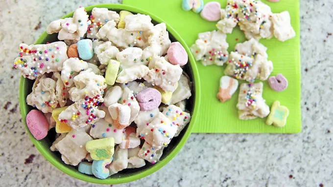 Chocolaty Muddy Buddies® and pretzels get coated with ALL THE COLORS in this super simple, party-perfect rainbow snackable.