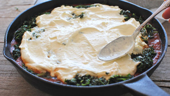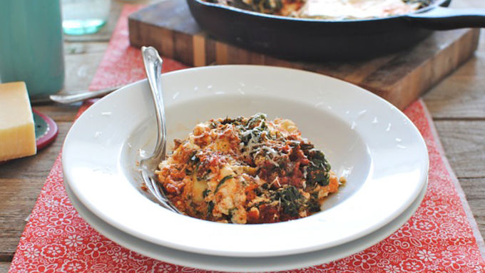 This easy lasagna made with frozen ravioli, frozen spinach, and jarred sauce in a cast-iron skillet is going into heavy rotation for weeknight dinner plans.