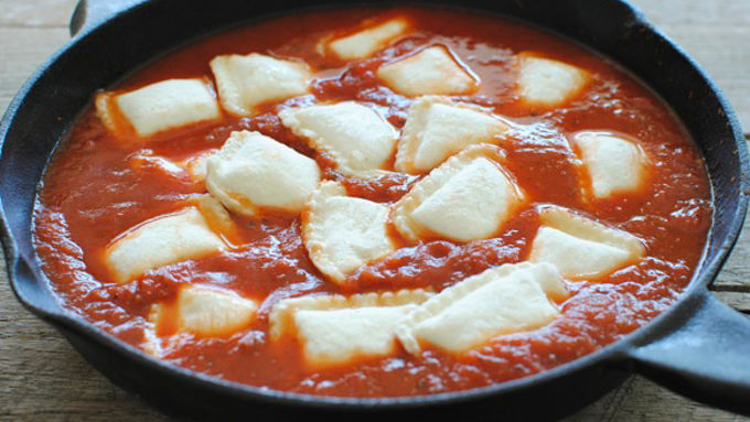 Step1Add marinara sauce and 1/3 cup water to a 10-inch skillet and bring to a boil. Add the frozen ravioli and simmer, covered, over medium heat for 3 minutes.