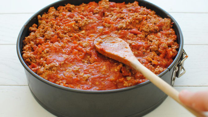 - Can you even begin to believe what you're looking at? Is it pasta? Is it a deep dish pizza pie? Is it ridiculous? Is it being summoned to your belly right about now? Yes, yes, yes, yes and yes. Before we go on, I'm telling you now, this wasn't my original idea. But when we saw it over on the Noble Pig , all of my lids flipped at once, I experienced blindness and heart murmurs, and strange utterances escaped my lips, along with tiny rivers of drool. It had to be done. I veered from her recipe just a tad, replacing beef with turkey, and adding crushed red pepper flakes for a good kick in the pants. Grab some rigatoni, some ground turkey, Muir Glen whole peeled tomatoes, garlic, crushed red pepper, parmesan and mozzarella cheese. To crush your own tomatoes, dump them in a big bowl and crush them with your hands. It feels awesome, yes. It looks weird, sorry. You can also buy tomatoes that are already crushed, but you'll miss out on all the squishy fun. Then get your turkey all browned up in a pan with the garlic and crushed red pepper. And salt! Next you'll add the tomatoes and simmer for about 20 minutes. While you're at it (see, you'll do all this at the same time, and your sauce will simmer while you prepare the pie.), cook that rigatoni until it's slightly underdone, maybe 3 minutes under what the box says. Then drain it under some cool water. Toss the rigatoni with a cup of Parmesan and pack it into a springform pan with noodles standing on end. They might be different heights, and that's okay. Once it's all packed in the pan, pour the sauce on top. And then as best you can, try and push the meat sauce down into the pasta holes to fill the noodles. Once it's all baked and cheesy, let it set up for about 15 minutes before removing the springform pan and slicing. Voila! I laughed so hard when I took mine out of the pan. You have GOT to try this.