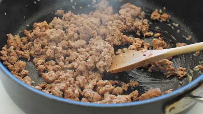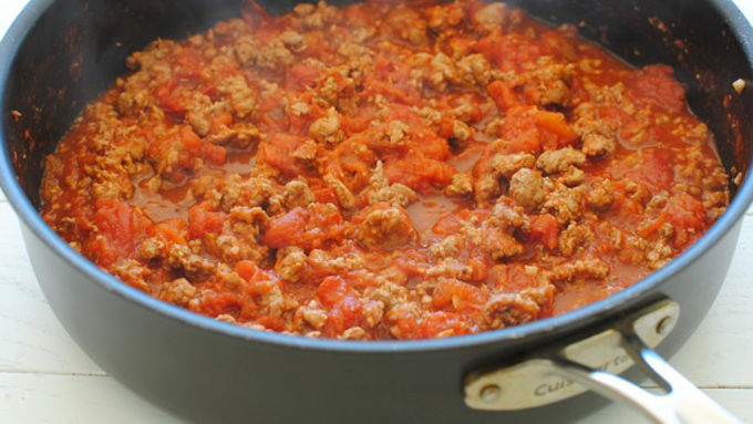 Step4Pour the meat sauce over the pasta. Push the meat down into the holes in the noodles as best you can. Bake for 15 minutes.![]()
