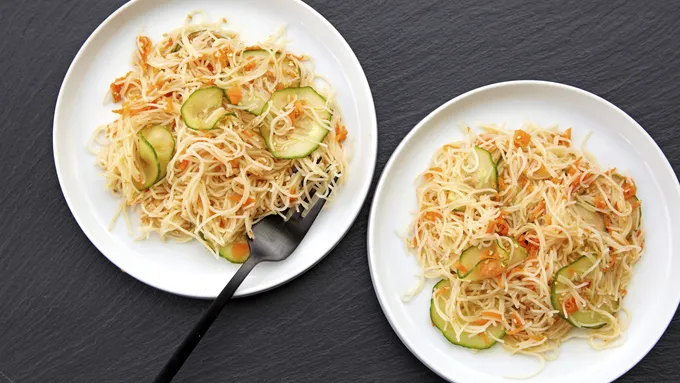 Step1In a large bowl, stir together the orzo, carrots, and sugar snap peas. Set aside.