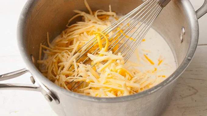 Step3Add milk slowly to the roux, whisking constantly, to form a sauce. Once all milk is added to the pot, let thicken and add cheeses. Stir together to melt cheeses well. It should form a thick cheese sauce.![]()