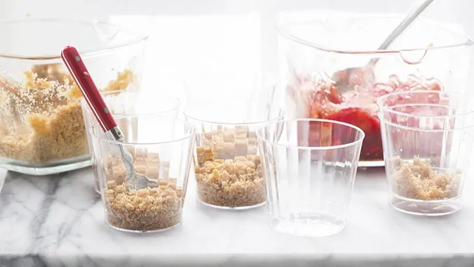 Step2Place pretzels in a food processor, pulse until crushed. Add butter and half the sugar/honey. Spoon into the bottom of eight 9 oz. plastic party cups.