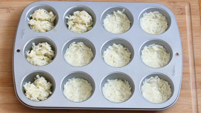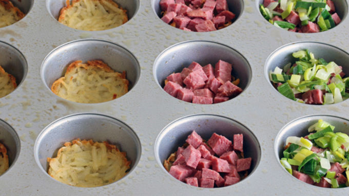 Step2While the leeks are cooking, combine the hash browns, olive oil, salt and pepper in a bowl. Press about 2 heaping tablespoons of hash brown mixture into each muffin cup. Distribute any remaining hash browns. Bake on the middle rack for 30-40 minutes or until the hash browns are golden brown.
