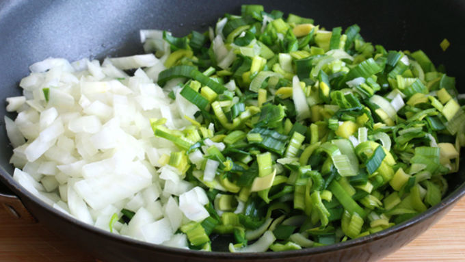 Step1Preheat the oven to 400°F. Grease a regular-sized 12-cup muffin tin. Melt the butter over medium-high heat and cook the leeks and onions for 6-7 minutes until tender.
