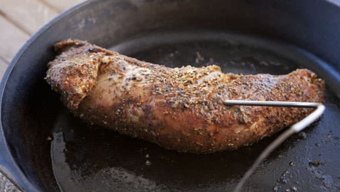 Step2Preheat oven to 350°F. Add pork loin to a baking dish (I like to use a cast iron skillet) and roast until the pork reaches an internal temperature of 140-145°F . Use a meat thermometer to ensure doneness.![]()
