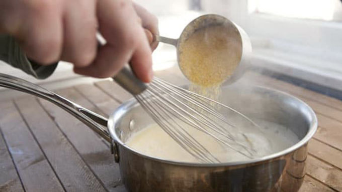 Step5When mixture is simmering, whisk in grits slowly and stir well.![]()