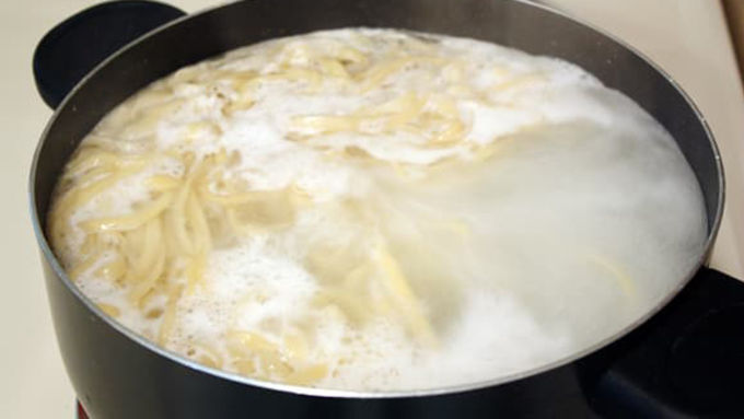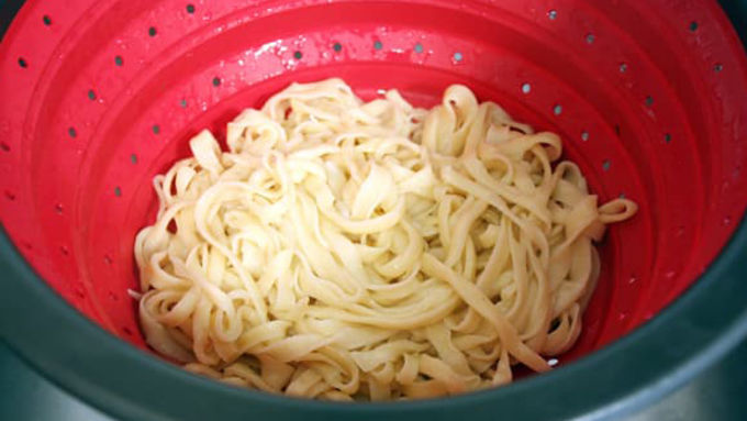 Step6Meanwhile, bring a large pot of salted water to a bowl. Carefully shake excess flour off noodles and slowly lower into water, a few at a time. Cook about 4 minutes or until al dente.