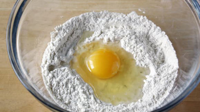 Step1In a large bowl, whisk together flour and salt. Make a well in the center and add 1 egg and water to the well.