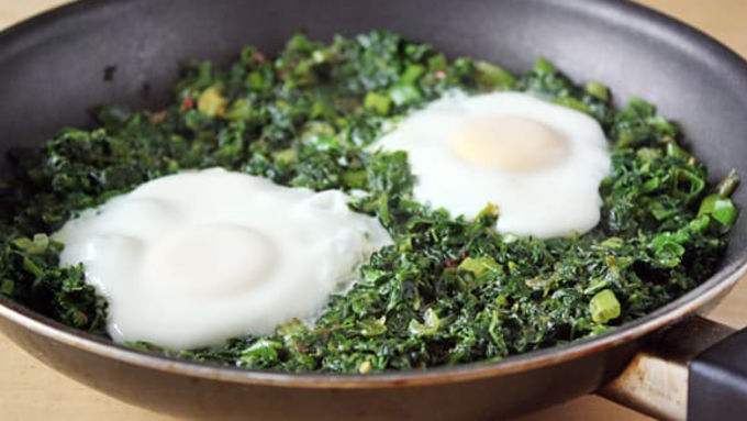 Step9Make two wells in the greens mixture and crack an egg in each well. Cover skillet and poach eggs for 4-5 minutes.