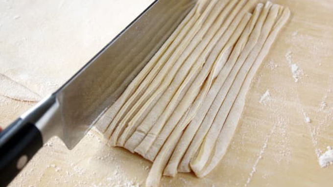 Step5Using a very sharp, long knife, slice dough horizontally into very thin noodles. Use fingers to unfold noodles and place on a floured baking sheet.