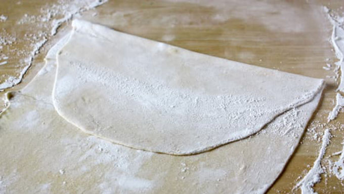Step4Remove dough from towel and place on a well-floured surface. Roll out to stretch super thin, about 1 mm thick. Sprinkle top with flour and fold dough over itself twice in the same direction. Flour the top.
