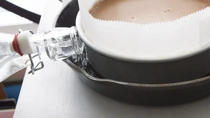 Step3Spoon into a 7" cake pan that has been lined and rimmed with parchment paper. Place this cake pan into a large baking dish and carefully fill the outside baking dish with 1" of water. Be careful to not get any water inside your cake pan.