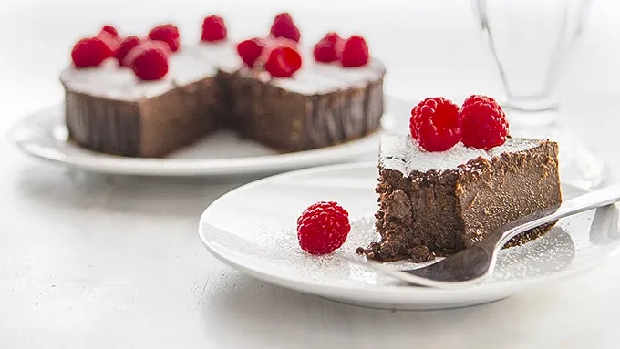 - So easy, it's sinful. So luscious, it's... still sinful! No one has ever been more excited about chocolate cake than I am about this recipe. It’s brilliant. It’s simple. It’s so good, it’ll make you weep tears all over big, ruby raspberries, even as you slide this fudgy, flourless cake into your face. It’s perfection, I tell you. Perfection! We were inspired by easy flourless cakeslike this one by Tablespoon fave food blogger, Gimme Some Oven, but we wanted to twist it up a bit. Our twist? We scrapped the butter in favor of adding rich, scrumptious chocolate FROSTING -- baked right into the batter! I served mine upside down because I thought it looked so pretty with that straight top. It’s like the flattop on the first boy I ever kissed. And speaking of kissing, a smooch of powdered sugar gives it just the right touch of love. And then the raspberries pucker their way across the top to make it the perfect treat for anyone you love this Valentine's Day. Especially you. Smooch! SWAK! Scrumptious.