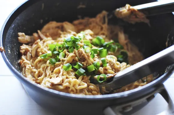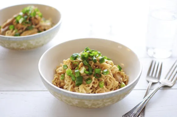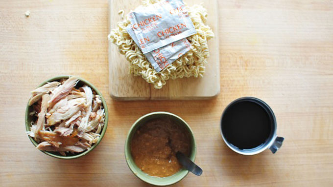 With just 4 ingredients, turn a package of ramen into a gourmet meal with leftover shredded chicken and a nutty peanut sauce.