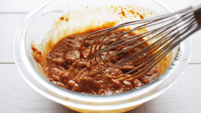 Step2In a small bowl, whisk together the peanut butter and soy sauce. Add a couple tablespoons of water to thin it out if needed.