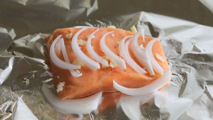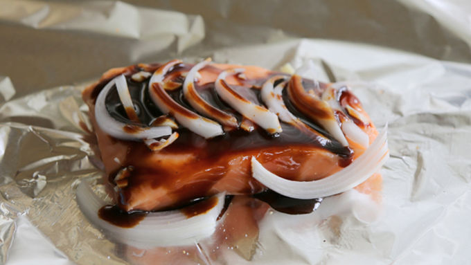 Step2Place each fillet of salmon on its own rectangle of foil. Add 1/2 clove of garlic to each fillet and some sliced onions on top. Drizzle each piece of salmon with 2 Tablespoons of teriyaki sauce.