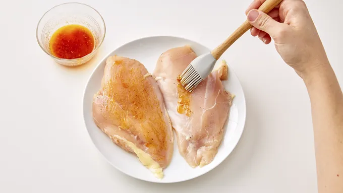 Step1In small bowl, mix butter, salt, garlic powder, smoked paprika and pepper. Brush both sides of chicken breasts with butter mixture.