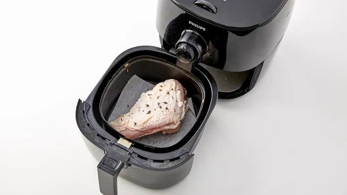 Step3Set to 325°F; cook 30 minutes. Using tongs, carefully turn breast over. Cook 27 to 32 minutes or until internal temperature is at least 165°F. Remove from basket; let stand 10 minutes before slicing.