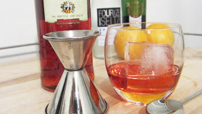 Step2Pour equal parts Campari and Sweet Vermouth into the glass and stir with a bar spoon.
