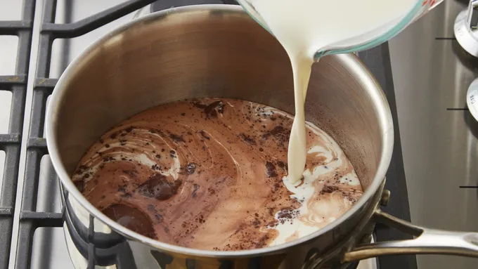 Step2In 2-quart saucepan, mix granulated sugar and baking cocoa. Using whisk, gradually stir in milk and whipping cream until well blended.