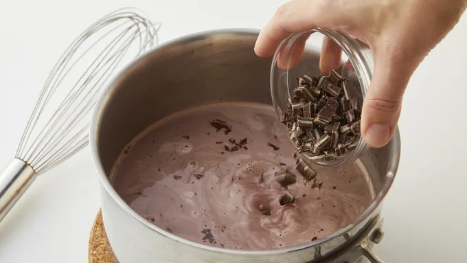 Step4Add chocolate and 1/4 cup of the mints; stir constantly with whisk until chocolate is melted and mixture is smooth.